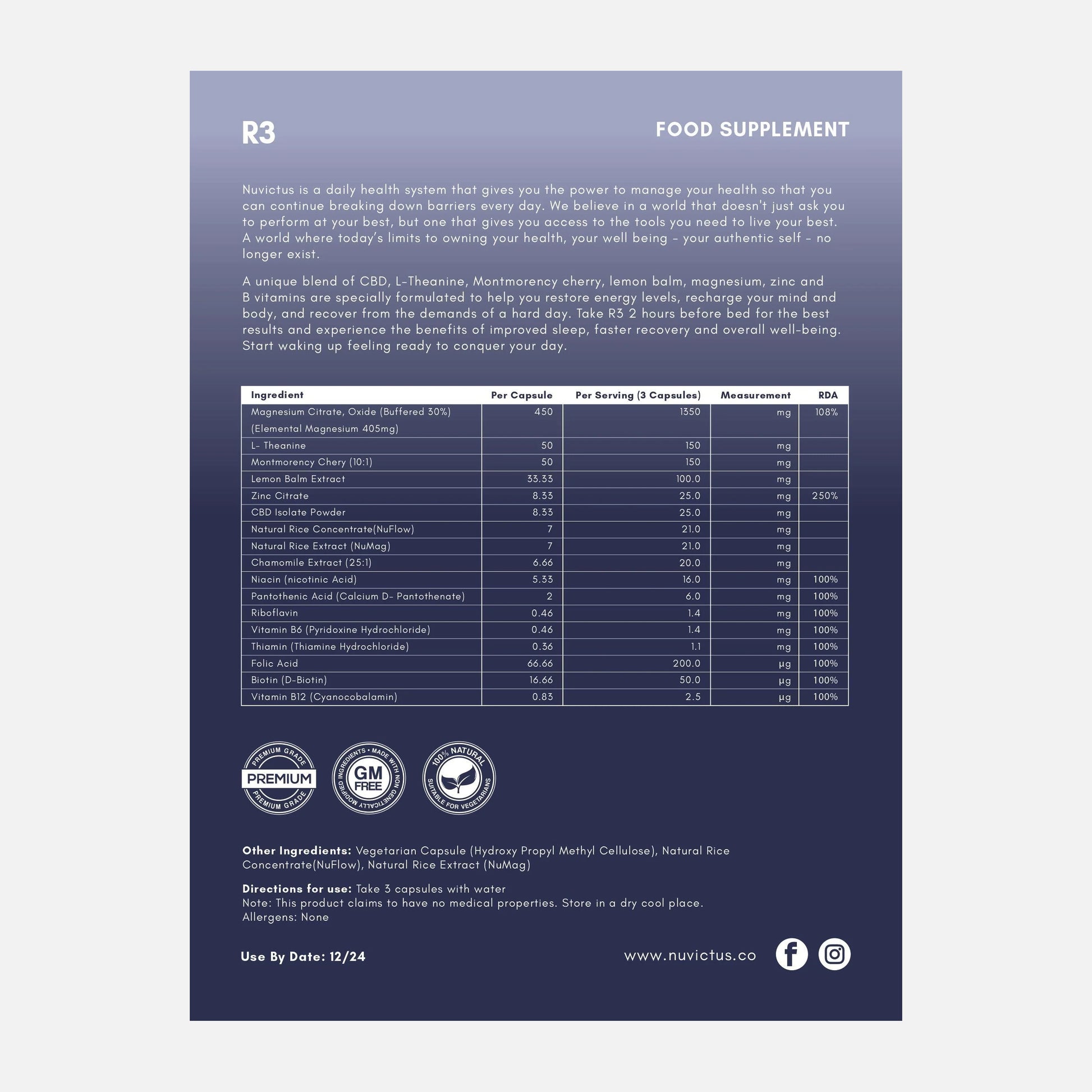 We developed R3 to eradicate that, and help people naturally doze off into a deep restorative sleep, allowing their body and mind to recover, and helping them to wake up feel restored, refreshed and ready to take on the world!